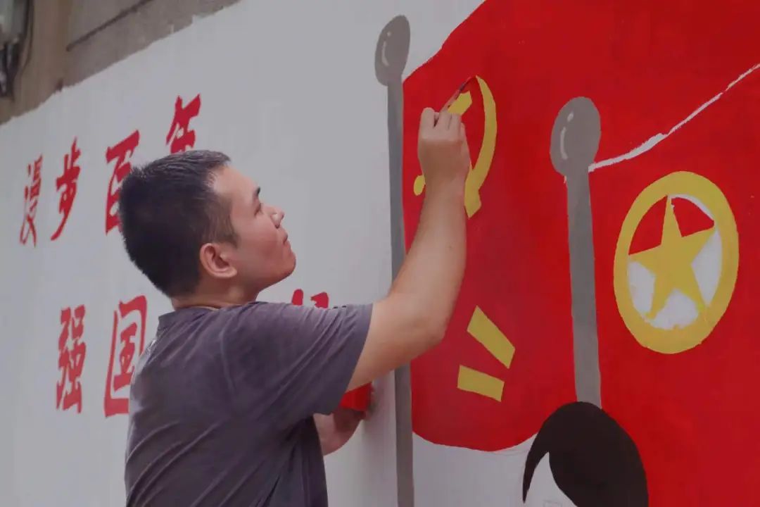 为避免矿物颜料受光照、温度变化而产生干湿变化,导致出现色差,他和队员们常常沐浴在37℃的室外“桑拿房”中,一站就是10小时,手托调色盘,汗水湿透了衣裤,烈日晒黑了面颊,200余面白墙逐渐变成了美观、会“说话”的“文明画卷”,路过的孩子们纷纷驻足欣赏,从小立志争做先锋榜样。