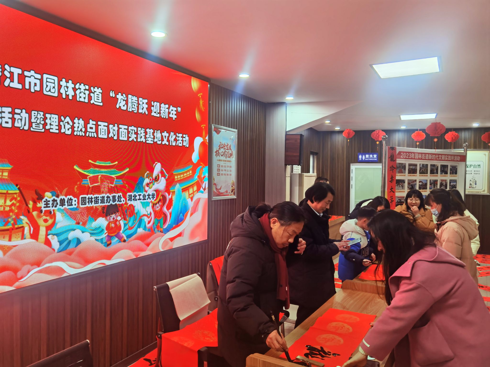 “龙腾跃 迎新年”,园林街道新时代文明实践所的新春民俗活动也热闹非凡。宣讲团成员与园林街道居民群众、非遗传承人一起看皮影戏、写春联、剪窗花、听道情。“潜江的道情非常有特色,贴近群众,朗朗上口,下一步我们要把理论宣讲融入到道情中,让我们的宣讲更有亲和力”湖北工业大学马克思主义学院院长丁银河与在场宣讲成员一同探讨如何结合潜江的风土民情丰富宣讲方式。今年的民俗活动与往年不同,宣讲团深入群众中,以故事、问答等多种形式开展沉浸式宣讲,推动理论宣讲的入脑入心。