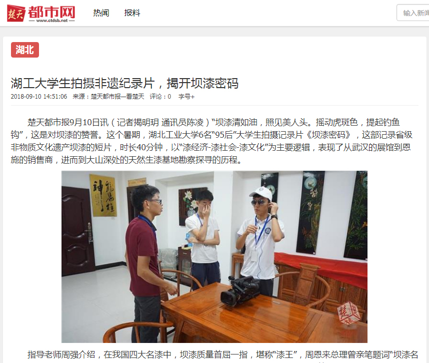 2018年7月底至8月初,非遗中心依托课题《坝漆文化遗产调查整理与综合保护研究》,指导 “道年传媒工作室”,花费10天,行程3000余公里,寻访拍漆产地、产业园、传承人、国漆厂,拍摄了50GB的视频资料,剪辑制作了一部40分钟的非遗纪录微电影《坝漆密码》。微电影分序幕、漆路溯源、漆艺见闻、漆场寻访、漆乡探秘、漆山朝宗、尾声等7个部分,在优酷网在线直播,周点击率超过1500人次。楚天都市报对此进行了报道,产生了较好的社会反响。