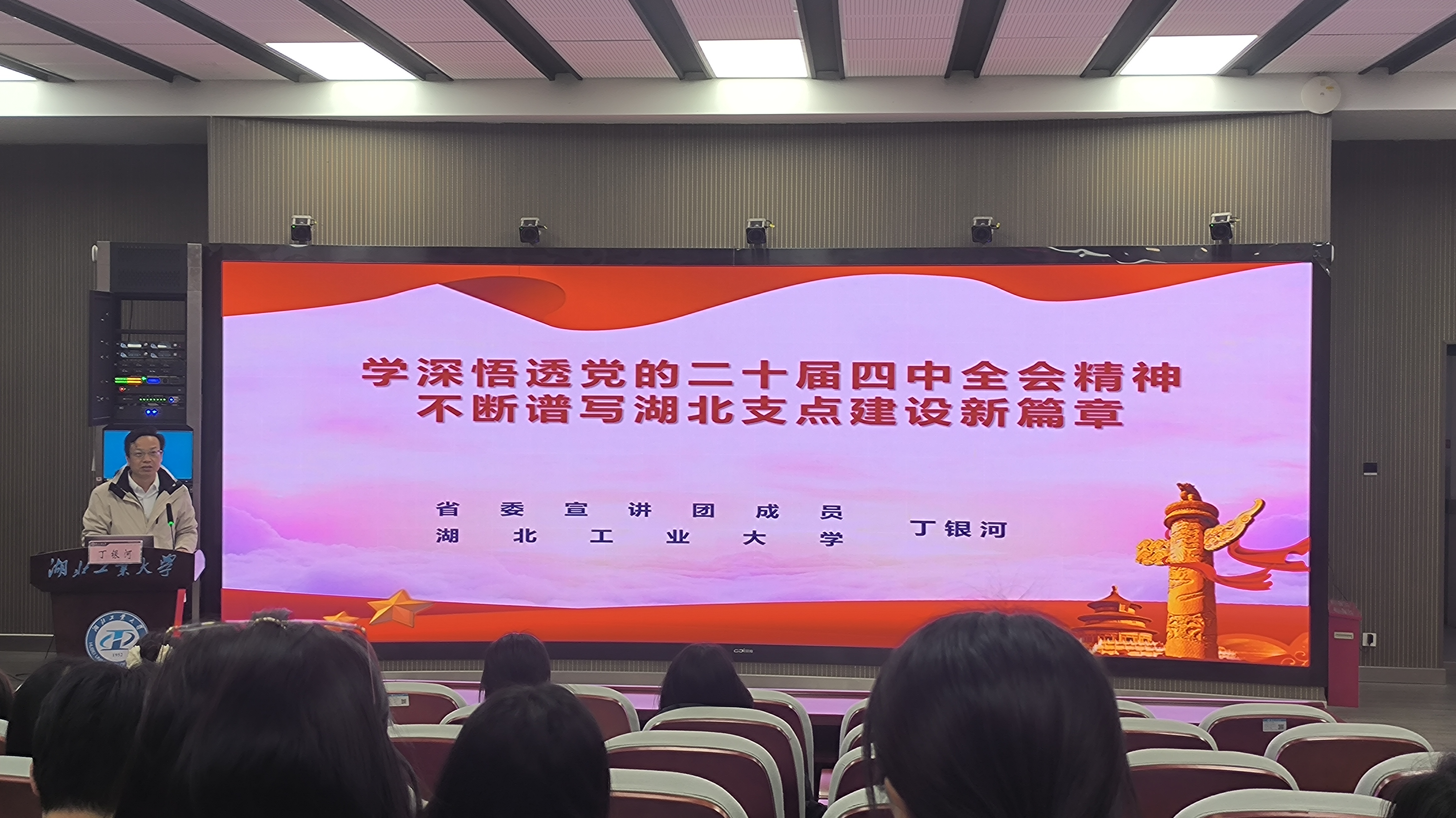 以思想伟力引领征程,以科学谋划擘画未来。党的二十届四中全会为新时代新征程党和国家事业发展指明了前进方向、提供了根本遵循。湖北省各级各部门坚持在“学深悟透、融会贯通”上下功夫,在“对标对表、落实落地”上求实效,切实把思想和行动统一到全会精神上来。在此背景下,马克思主义学院于12月4日下午组织党的二十届四中全会精神宣讲,省委宣讲团成员、湖北工业大学党委宣讲团成员、学院院长丁银河进行了宣讲,学院领导班子成员、全体教师及研究生参加会议。