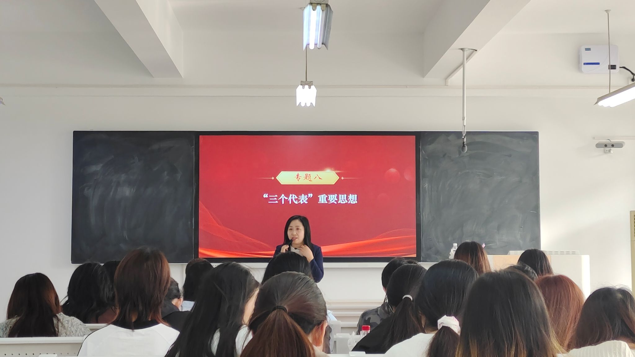 华倩本次教学展示主要讲授《毛泽东思想与中国特色社会主义理论体系概论》第八专题“三个代表”重要思想有关内容。授课过程中,华倩以热点时事为导入,灵活运用案例教学法,并结合亲身经历生动详实地介绍了“三个代表”重要思想的核心观点、主要内容与历史地位,并与学生积极开展互动。