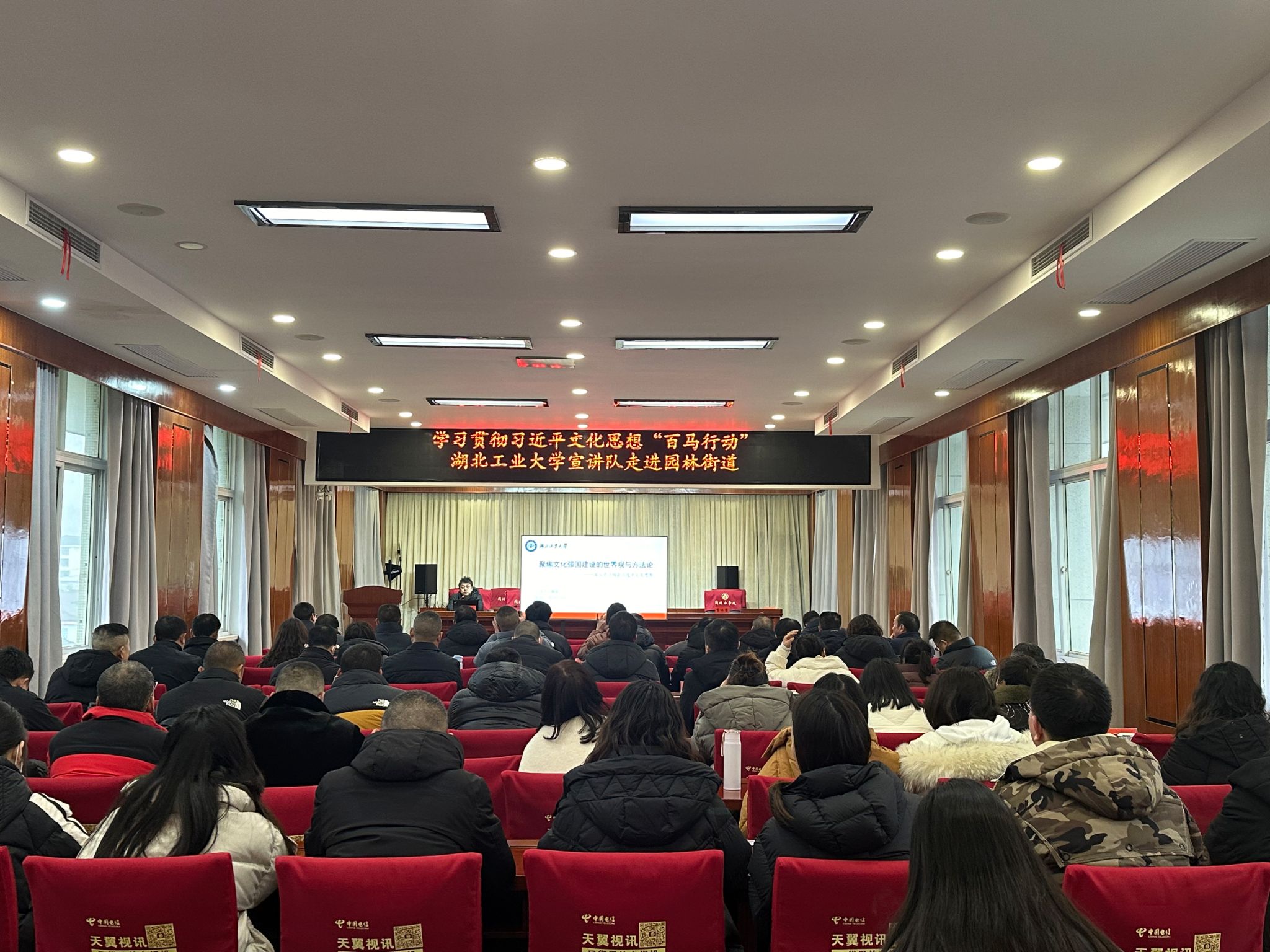 活动当天,首先由湖北工业大学党委教师工作部副部长韩东以《聚焦文化强国建设的世界观与方法论——深入学习习近平文化思想》为题,为园林街道机关干部、社区及群众代表作专题辅导。湖北工业大学马克思学院副院长华倩、党委教师工作部副部长韩东、孙耀胜教授、张艳丽教授、何家华博士、李筱雪博士等人组成“百马宣讲队”分别在红庙社区、泰丰街道、浩口镇、龙湾镇等6个社区村镇开展分众宣讲,将习近平文化思想与当地社情、民情紧密结合,用通俗易懂的语言将习近平文化思想的重大意义、内容体系、中华民族意蕴和实践要求等传送给广大基层党员干部和人民群众。据悉,湖北工业大学自1月初便积极组织百马宣讲团成员开展集体备课,深入挖掘潜江历史文化与风土民情,宣讲现场观众积极互动,频频点赞。