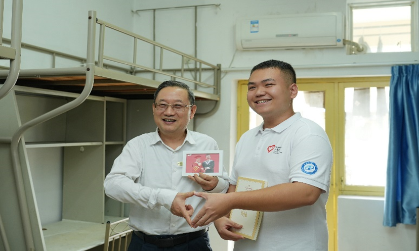 在西区十四栋322宿舍,彭育园向同学们赠送了自己亲笔题写了新生寄语的专业书籍《十五部马恩经典著作导读》,强调了学好马克思主义学科的重要性,嘱咐同学们要尽快调整状态,适应大学新生活。322宿舍的雷铭宇同学在收到新生礼物的同时,也立刻回赠了一份特别的礼物:本科毕业典礼上他和彭育园书记的合影。